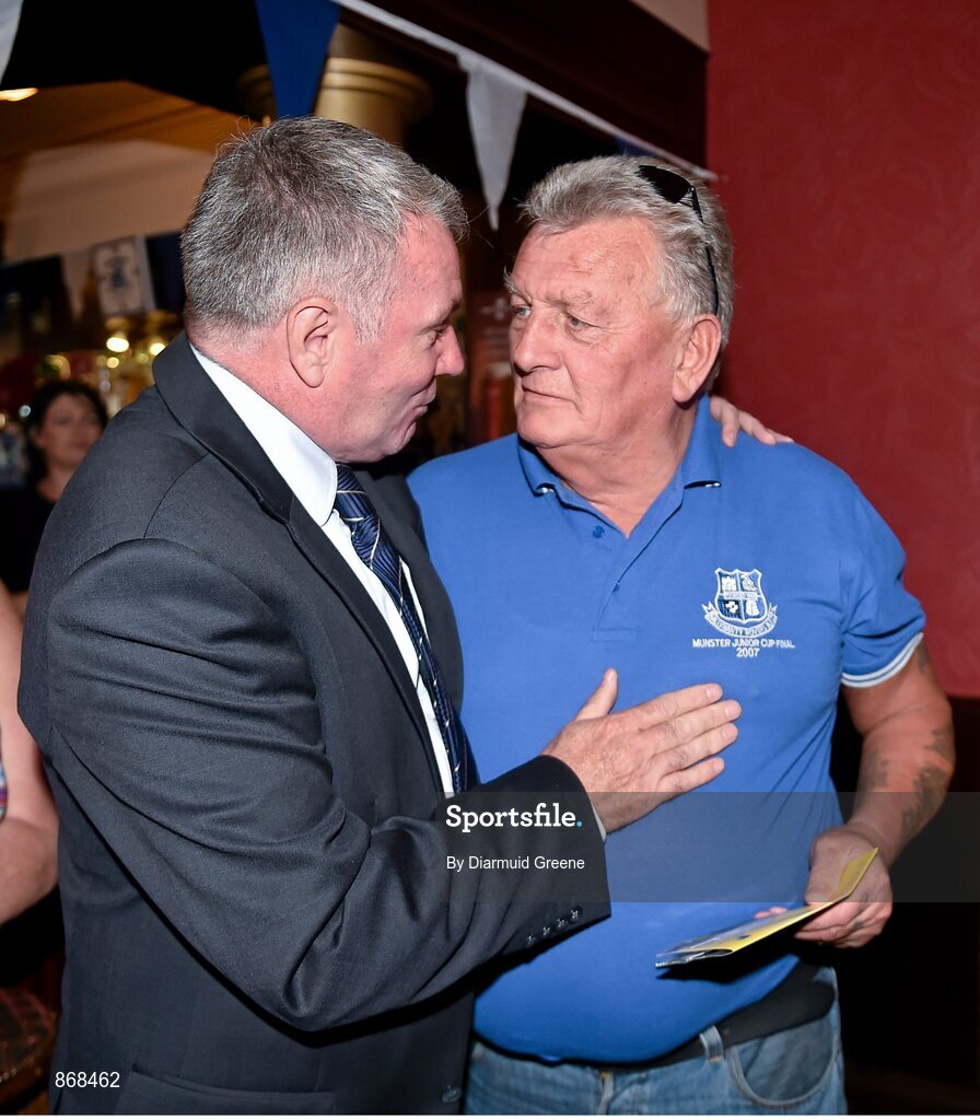 20 May 2014; Former Republic of Ireland international Ray Houghton presents VIP match tickets to Ballynanty Rovers AFC supporter Pakie Kelly during the FAI Junior Cup Aviva Communities Day ahead of Sunday's Final at the Aviva Stadium. Fitzgerald's Bar, Thomondgate, Limerick. Picture credit: Diarmuid Greene / SPORTSFILE