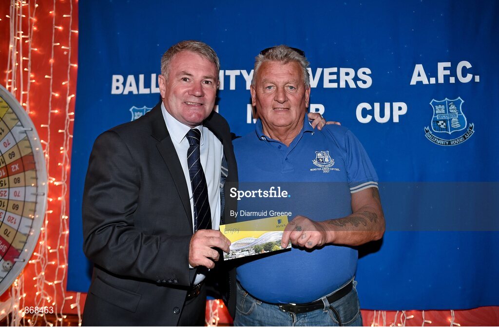 20 May 2014; Former Republic of Ireland international Ray Houghton presents VIP match tickets to Ballynanty Rovers AFC supporter Pakie Kelly during the FAI Junior Cup Aviva Communities Day ahead of Sunday's Final at the Aviva Stadium. Fitzgerald's Bar, Thomondgate, Limerick. Picture credit: Diarmuid Greene / SPORTSFILE
