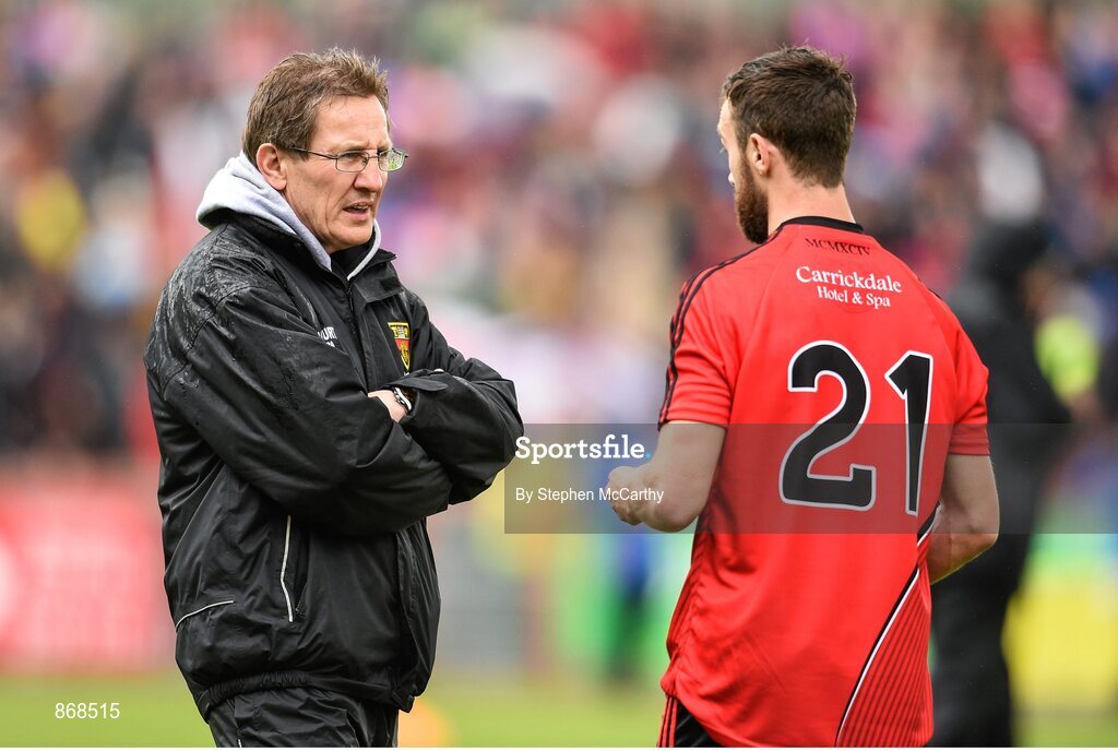 18 May 2014; Down coach Niall Moyna with Conor Laverty. Ulster GAA Football Senior Championship Preliminary Round, Tyrone v Down. Healy Park, Omagh, Co. Tyrone. Picture credit: Stephen McCarthy / SPORTSFILE