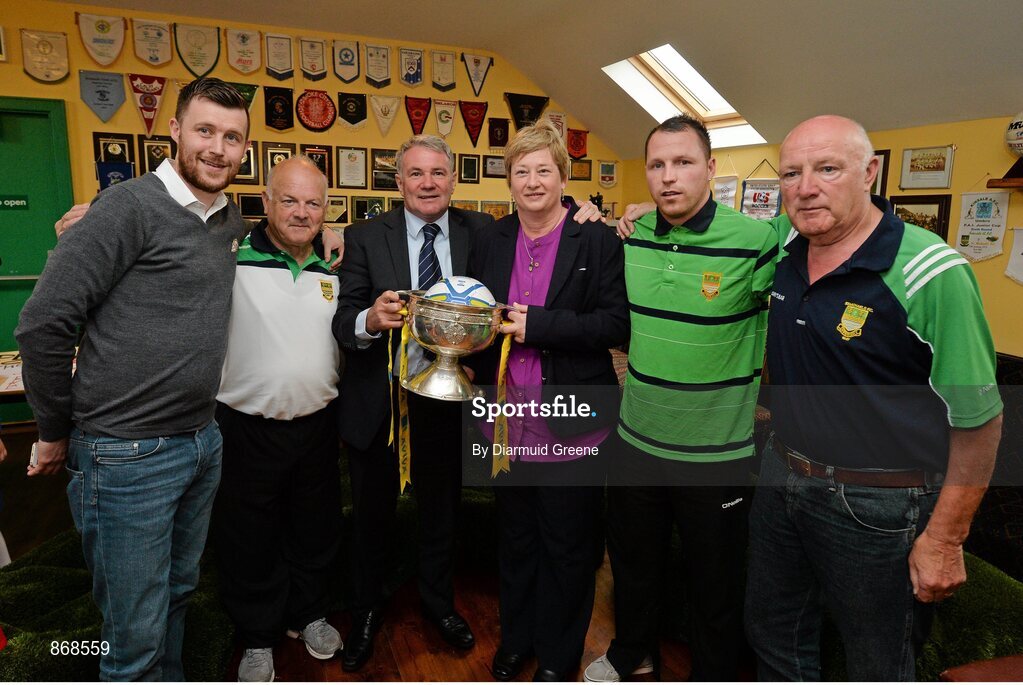 20 May 2014; From left to right, Alan Cawley, St. Michael's AFC kitman Jimmy Tobin, former Republic of Ireland international Ray Houghton, FAI Junior Council President Teresa McCabe, St. Michael's AF player Chris Higgins, and St. Michael's AFC president Michael Flynn during the FAI Junior Cup Aviva Communities Day ahead of Sunday's Final at the Aviva Stadium. St. Michael's AFC Clubhouse, Cooke Park, Tipperary Town. Picture credit: Diarmuid Greene / SPORTSFILE