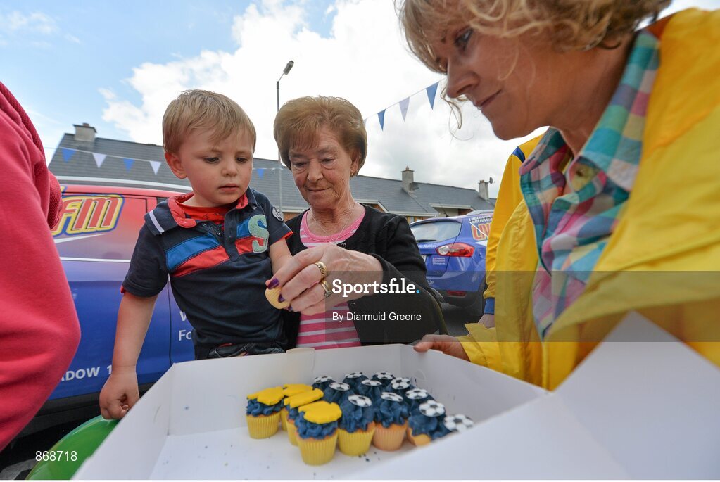 20 May 2014; Ballynanty Rovers AFC supporter Kieran Noonan, aged 3, along with Kathleen Lowe, takes a cupcake during the FAI Junior Cup Aviva Communities Day ahead of Sunday's Final at the Aviva Stadium. Ballynanty Community Centre, Limerick. Picture credit: Diarmuid Greene / SPORTSFILE