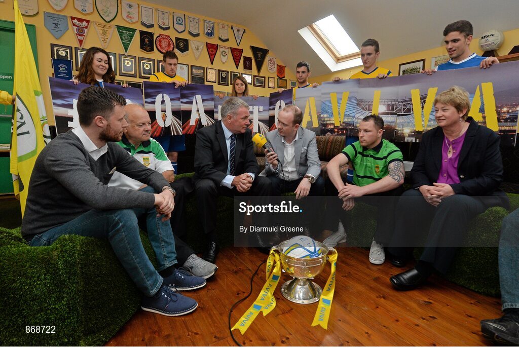 20 May 2014; A general view of a panel discussion including, from left to right, pundit Alan Cawley, St. Michael's AFC kitman Jimmy Tobin, former Republic of Ireland international Ray Houghton, MC Bernard O'Toole, St. Michael's AFC player Chris Higgins, and FAI Junior Council President Teresa McCabe during the FAI Junior Cup Aviva Communities Day ahead of Sunday's Final at the Aviva Stadium. St. Michael's AFC Clubhouse, Cooke Park, Tipperary Town. Picture credit: Diarmuid Greene / SPORTSFILE