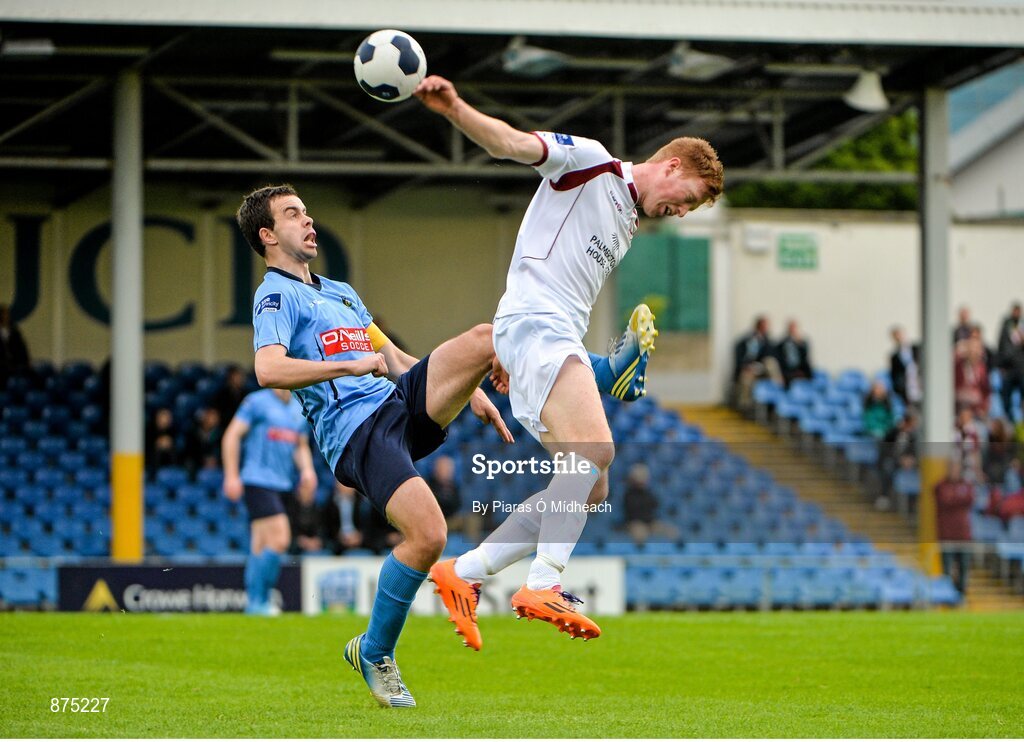 6 June 2014; Robbie Benson, UCD, in action against Gary Shananan, Galway. FAI Ford Cup, 2nd Round, UCD v Galway, UCD Bowl, Belfield, Dublin. Picture credit: Piaras Ó Mídheach / SPORTSFILE