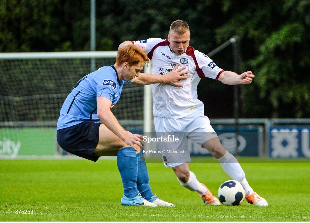 6 June 2014; Stephen Walsh, Galway, in action against Hugh Douglas, UCD. FAI Ford Cup, 2nd Round, UCD v Galway, UCD Bowl, Belfield, Dublin. Picture credit: Piaras Ó Mídheach / SPORTSFILE