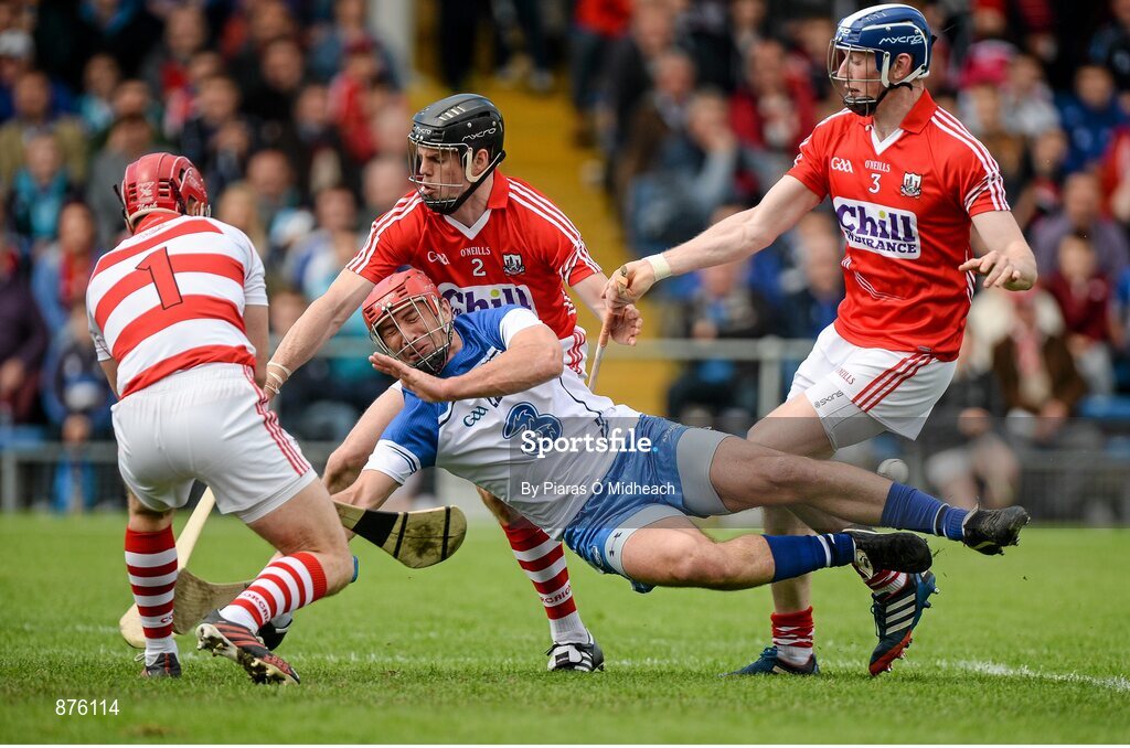 8 June 2014; Anthony Nash, Cork, supported by team-mates Shane O'Neill, centre, and Damien Cahalane, right, clears the ball from Seamus Prendergast, Waterford. Munster GAA Hurling Senior Championship, Quarter-Final Replay, Cork v Waterford, Semple Stadium, Thurles, Co. Tipperary. Picture credit: Piaras Ó Mídheach / SPORTSFILE
