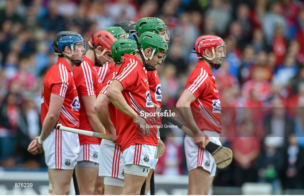 8 June 2014; Cork players, including Alan Cadogan, centre, stand together for the playing of the national anthem. Munster GAA Hurling Senior Championship, Quarter-Final Replay, Cork v Waterford, Semple Stadium, Thurles, Co. Tipperary. Picture credit: Diarmuid Greene / SPORTSFILE
