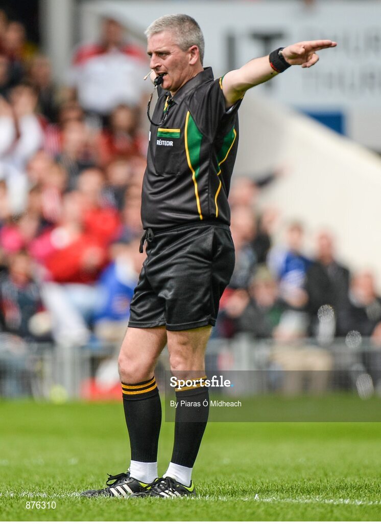 8 June 2014; Referee Johnny Ryan signals for a penalty. Munster GAA Hurling Senior Championship, Quarter-Final Replay, Cork v Waterford, Semple Stadium, Thurles, Co. Tipperary. Picture credit: Piaras Ó Mídheach / SPORTSFILE
