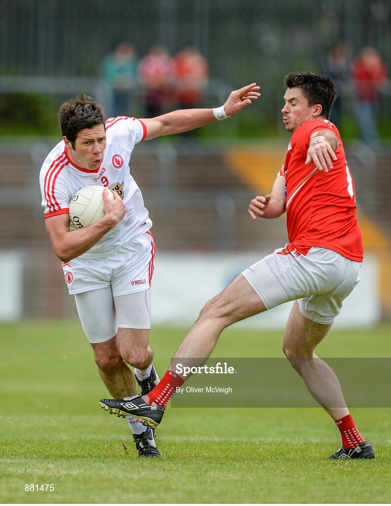28 June 2014; Sean Cavanagh, Tyrone, in action against Brian White, Louth. GAA Football All Ireland Senior Championship, Round 1B, Tyrone v Louth, Healy Park, Omagh, Co. Tyrone. Picture credit: Oliver McVeigh / SPORTSFILE
