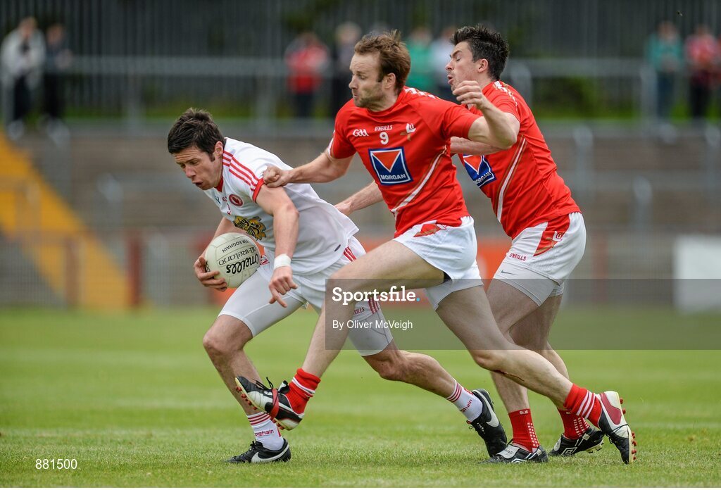 28 June 2014; Sean Cavanagh, Tyrone, in action against Brian White and Mick Fanning, Louth. GAA Football All Ireland Senior Championship, Round 1B, Tyrone v Louth, Healy Park, Omagh, Co. Tyrone. Picture credit: Oliver McVeigh / SPORTSFILE