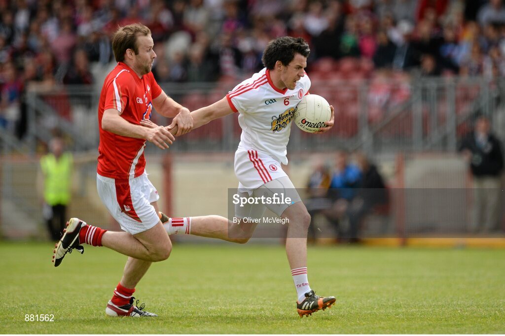 28 June 2014; Mattie Donnelly, Tyrone, in action against Mick Fanning, Louth. GAA Football All Ireland Senior Championship, Round 1B, Tyrone v Louth, Healy Park, Omagh, Co. Tyrone. Picture credit: Oliver McVeigh / SPORTSFILE