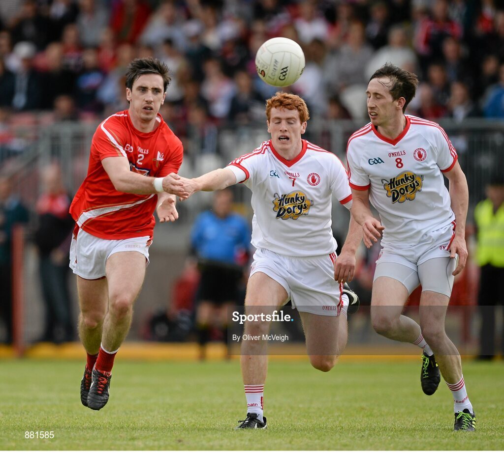 28 June 2014; Derek Maguire, Louth, in action against Peter Harte and Colm Cavanagh, Tyrone. GAA Football All Ireland Senior Championship, Round 1B, Tyrone v Louth, Healy Park, Omagh, Co. Tyrone. Picture credit: Oliver McVeigh / SPORTSFILE