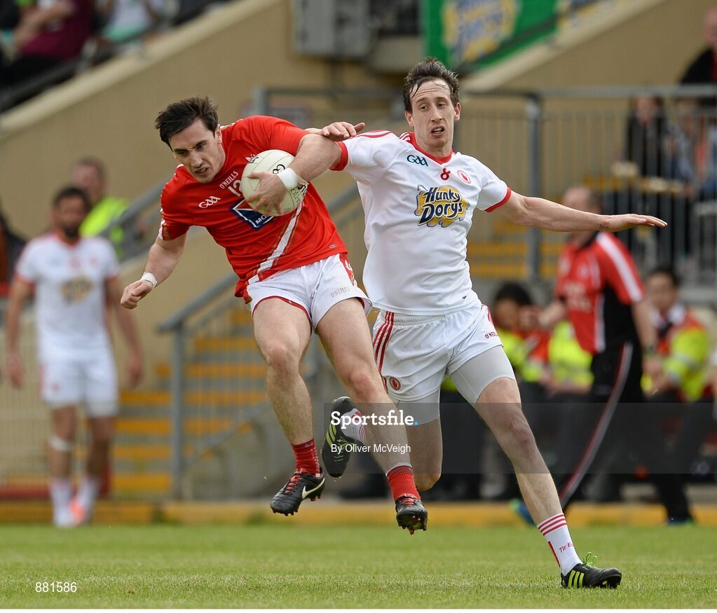 28 June 2014; Derek Maguire, Louth, in action against Colm Cavanagh, Tyrone. GAA Football All Ireland Senior Championship, Round 1B, Tyrone v Louth, Healy Park, Omagh, Co. Tyrone. Picture credit: Oliver McVeigh / SPORTSFILE