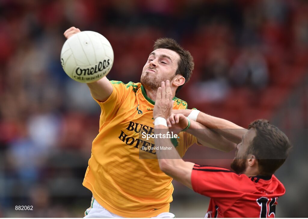 29 June 2014: Sean McWeeney, Leitrim, in action against Conor Laverty, Down. GAA Football All Ireland Senior Championship, Round 1B, Down v Leitrim, Páirc Esler, Newry, Co. Down. Picture credit: David Maher / SPORTSFILE
