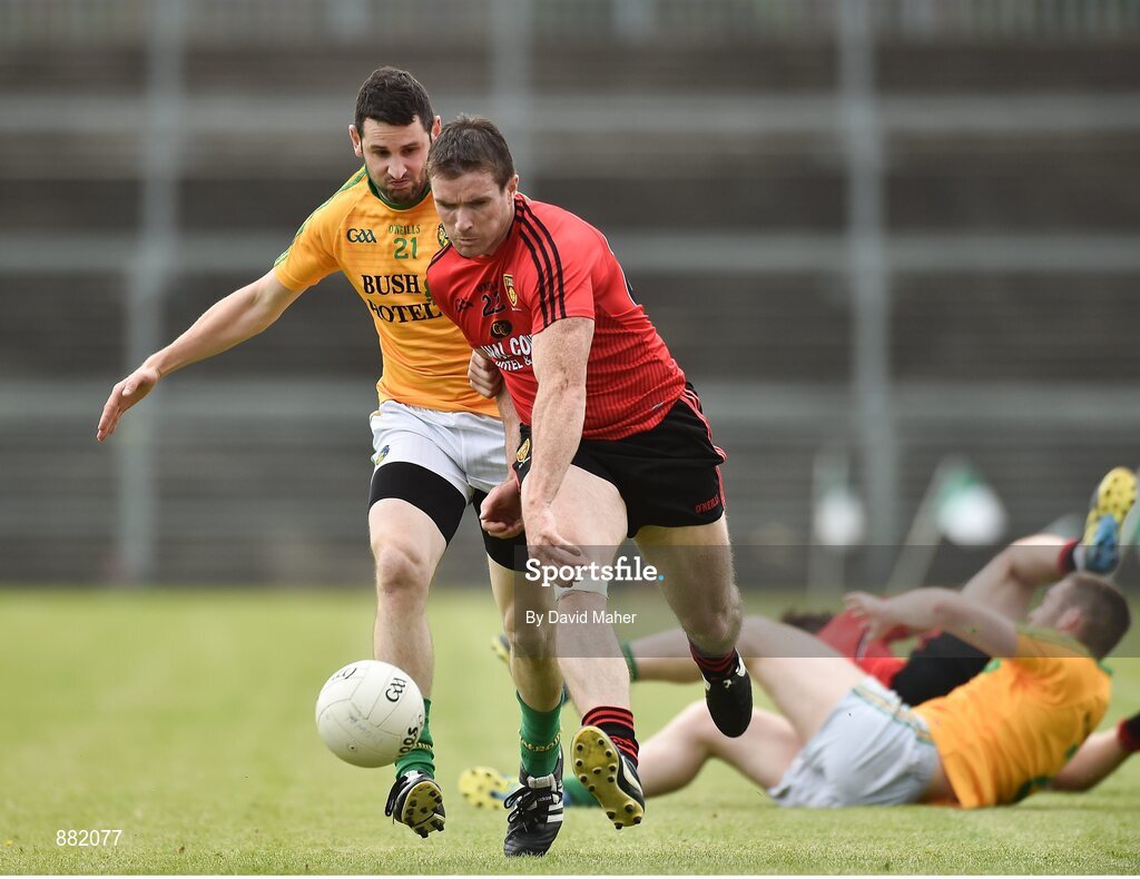 29 June 2014: Liam Doyle, Down, in action against Gavin Reynolds, Leitrim. GAA Football All Ireland Senior Championship, Round 1B, Down v Leitrim, Páirc Esler, Newry, Co. Down. Picture credit: David Maher / SPORTSFILE