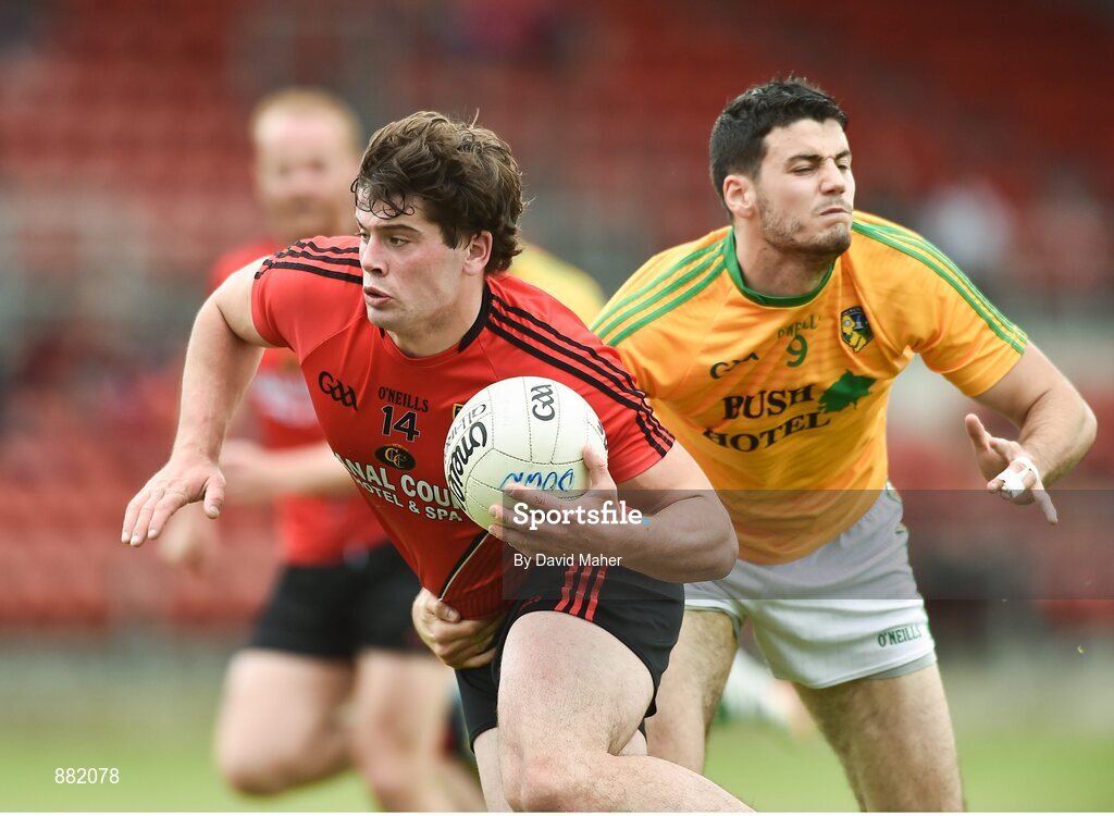 29 June 2014: Niall Madine, Down, in action against Damien Moran, Leitrim. GAA Football All Ireland Senior Championship, Round 1B, Down v Leitrim, Páirc Esler, Newry, Co. Down. Picture credit: David Maher / SPORTSFILE