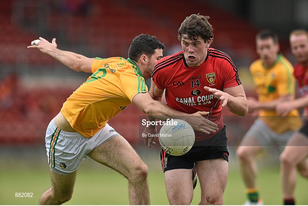 29 June 2014: Niall Madine, Down, in action against Damien Moran, Leitrim. GAA Football All Ireland Senior Championship, Round 1B, Down v Leitrim, Páirc Esler, Newry, Co. Down. Picture credit: David Maher / SPORTSFILE