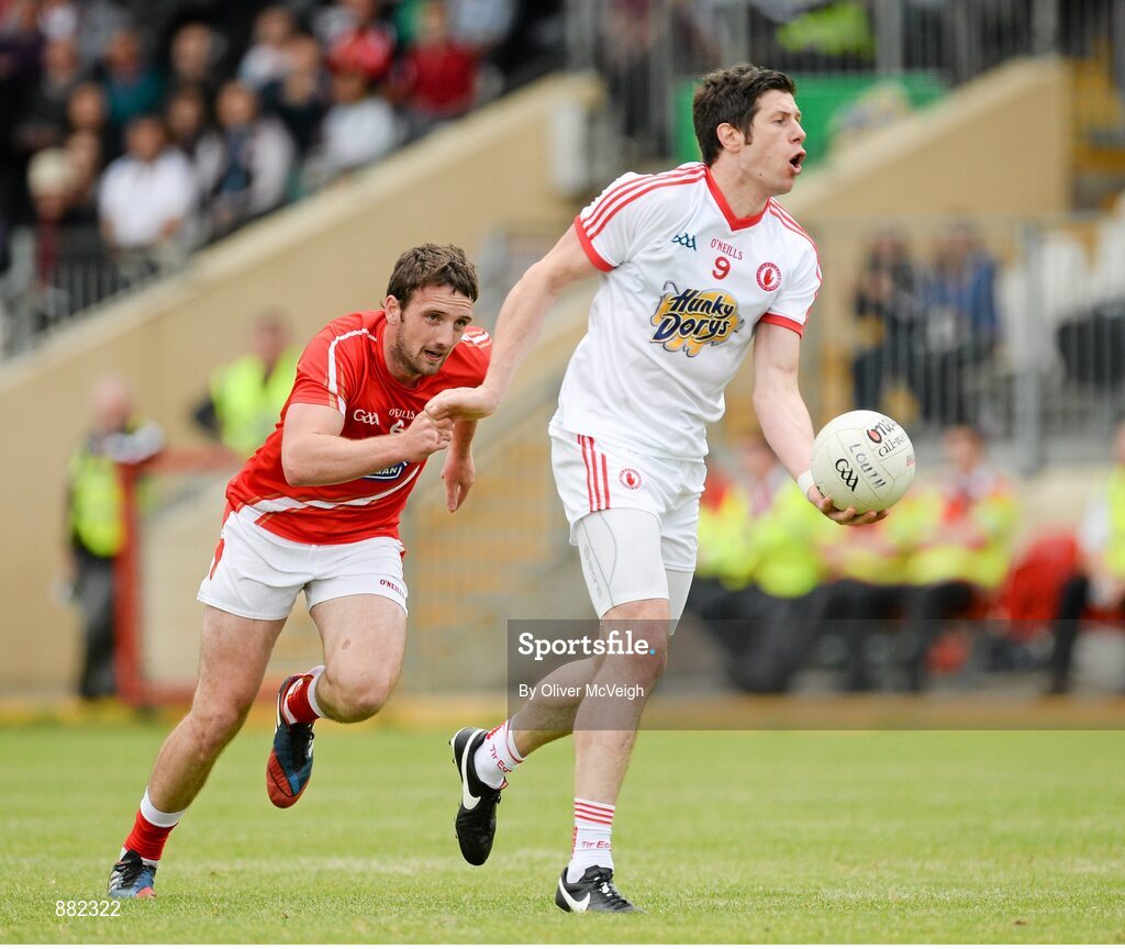 28 June 2014; Sean Cavanagh, Tyrone, in action against Derek Crilly, Louth. GAA Football All Ireland Senior Championship, Round 1B, Tyrone v Louth, Healy Park, Omagh, Co. Tyrone. Picture credit: Oliver McVeigh / SPORTSFILE