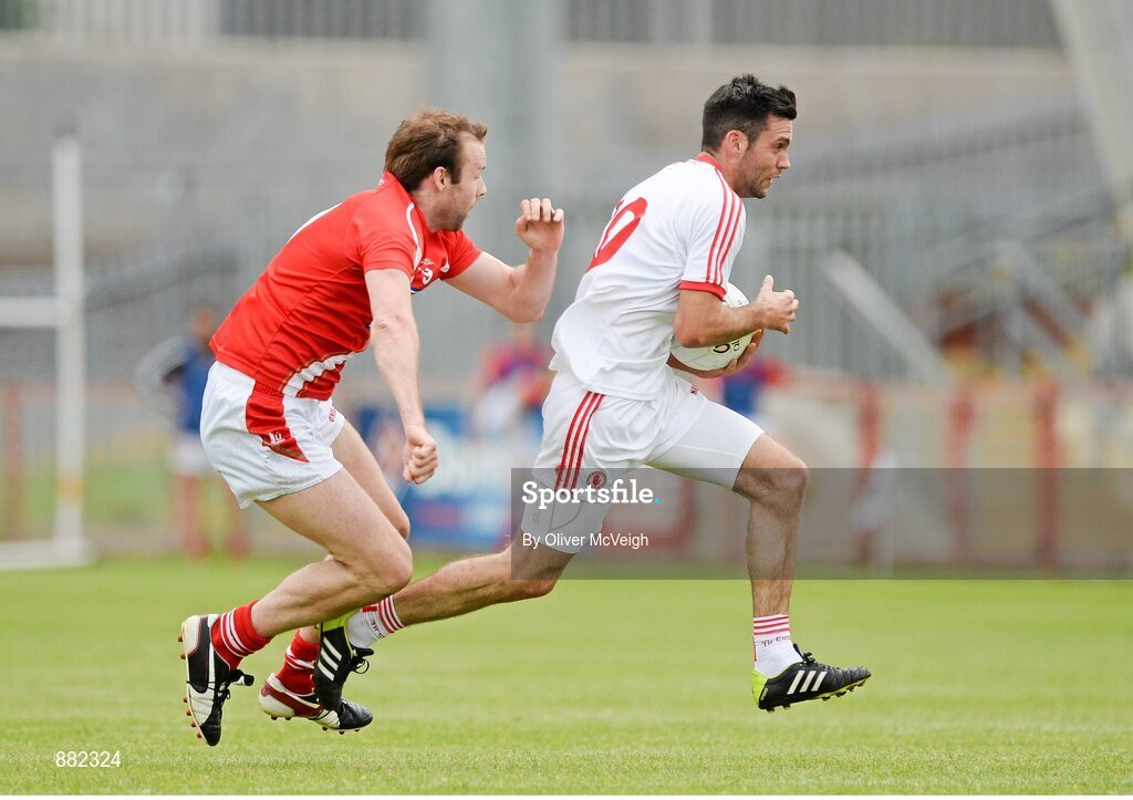 28 June 2014; Emmett McKenna, Tyrone, in action against Mick Fanning, Louth. GAA Football All Ireland Senior Championship, Round 1B, Tyrone v Louth, Healy Park, Omagh, Co. Tyrone. Picture credit: Oliver McVeigh / SPORTSFILE