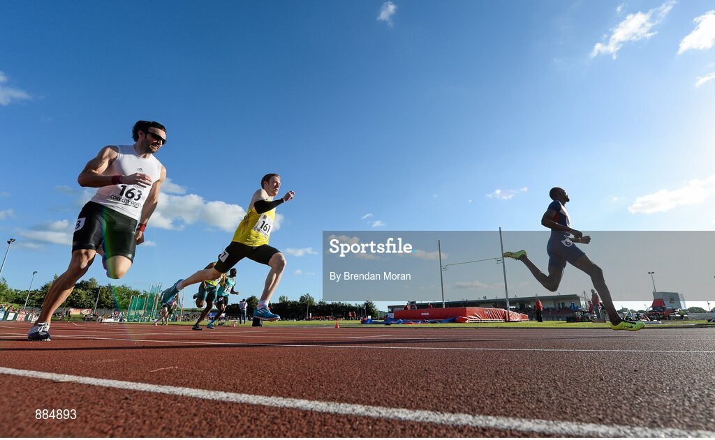 8 July 2014; Rabah Yousif, Great Britain, leads Jarryd Dunn, Great Britain, centre, and Brian Murphy, Ireland, during the Men's 400m. Cork City Sports 2014, CIT, Bishopstown, Cork. Picture credit: Brendan Moran / SPORTSFILE