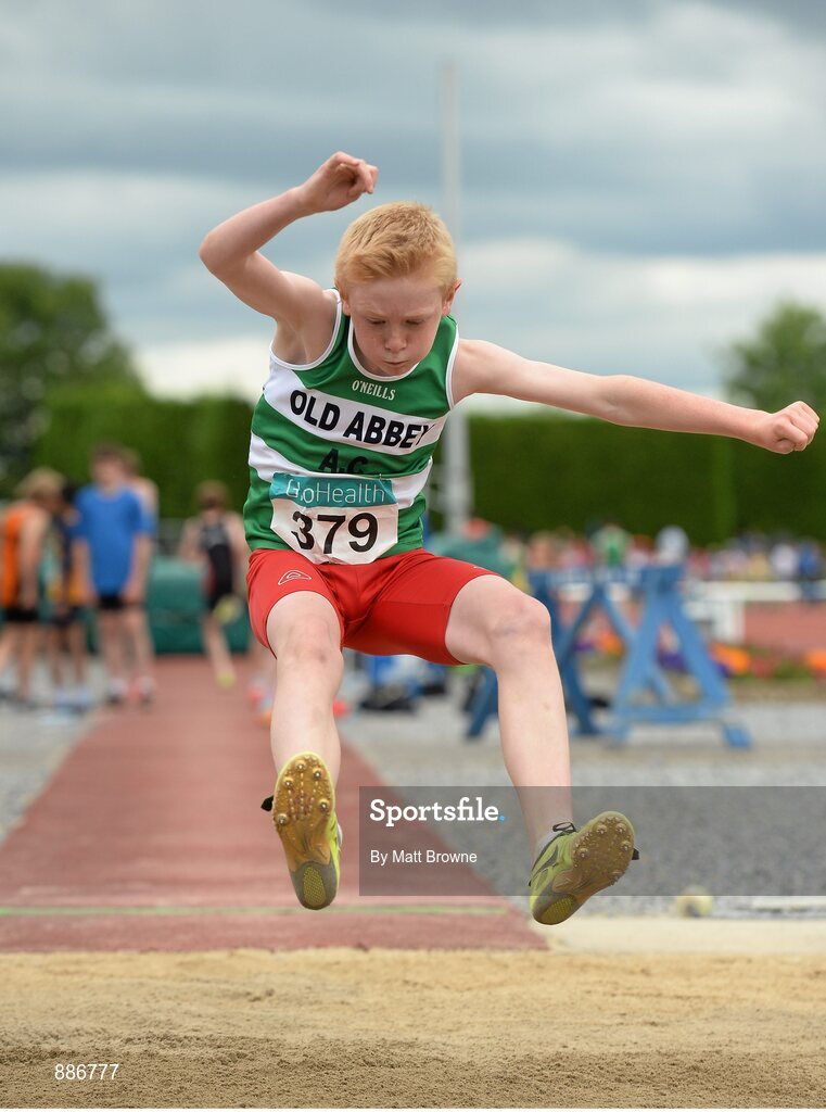 13 July 2014; Diarmuid O'Connor, from Old Abbey AC, Co. Cork, who won the boys under-13 long jump. GloHealth Juvenile Track and Field Championships, Tullamore Harriers AC, Tullamore, Co. Offaly. Picture credit: Matt Browne / SPORTSFILE