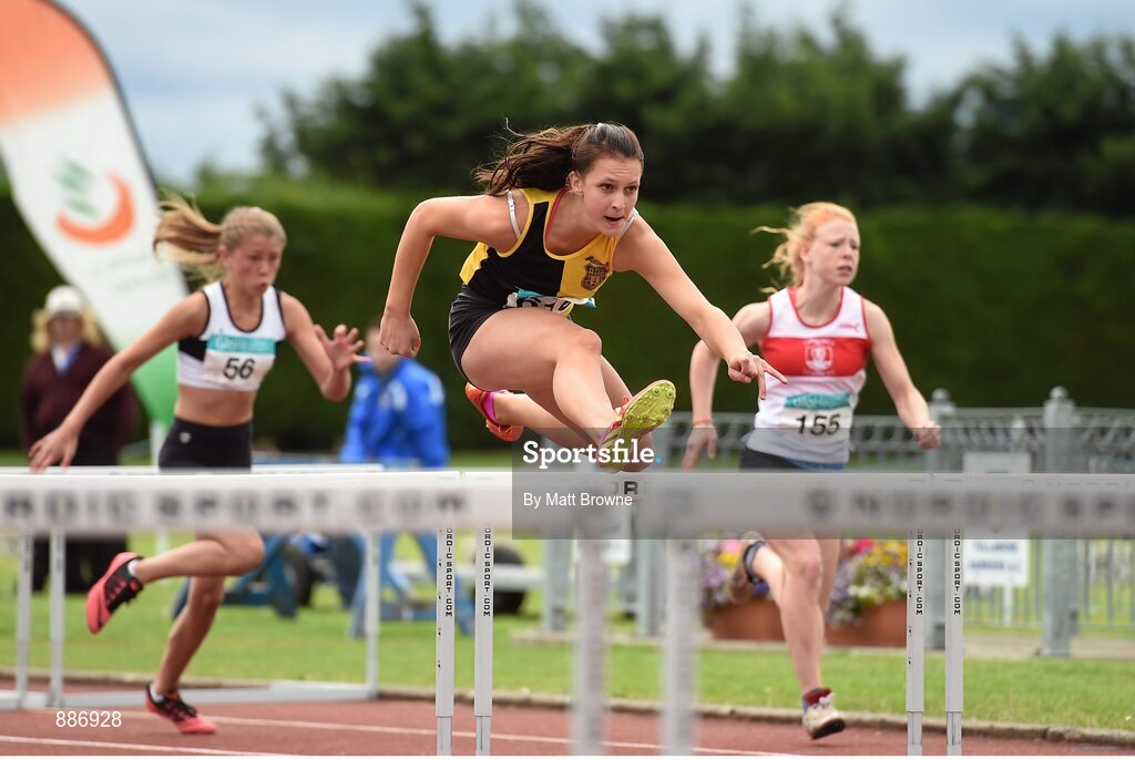 13 July 2014; Ciara Deely, from Kilkenny City Harriers AC, on her way to winning the girls under-15 80m hurdles. GloHealth Juvenile Track and Field Championships, Tullamore Harriers AC, Tullamore, Co. Offaly. Picture credit: Matt Browne / SPORTSFILE