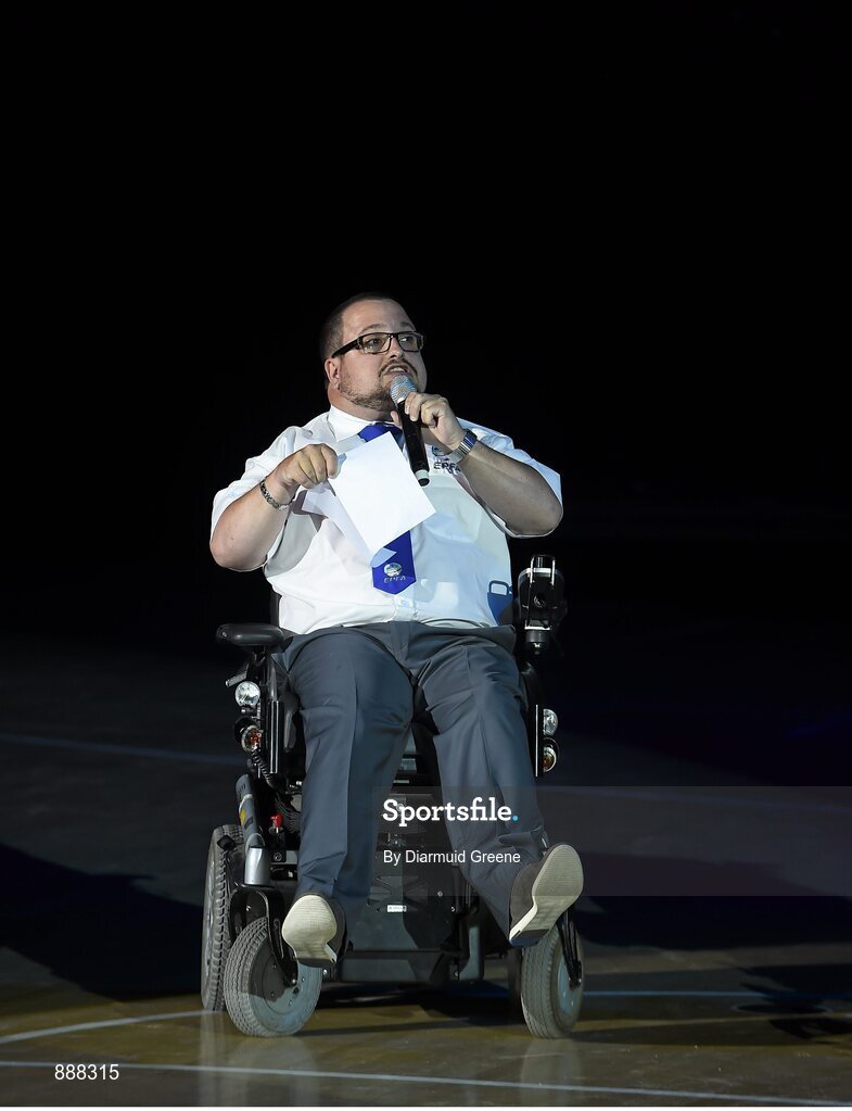 17 July 2014; European Powerchair Football Association president Nicholas Dubes speaking during the opening ceremony of the European Powerchair Football Nations Cup. University of Limerick, Limerick. Picture credit: Diarmuid Greene / SPORTSFILE