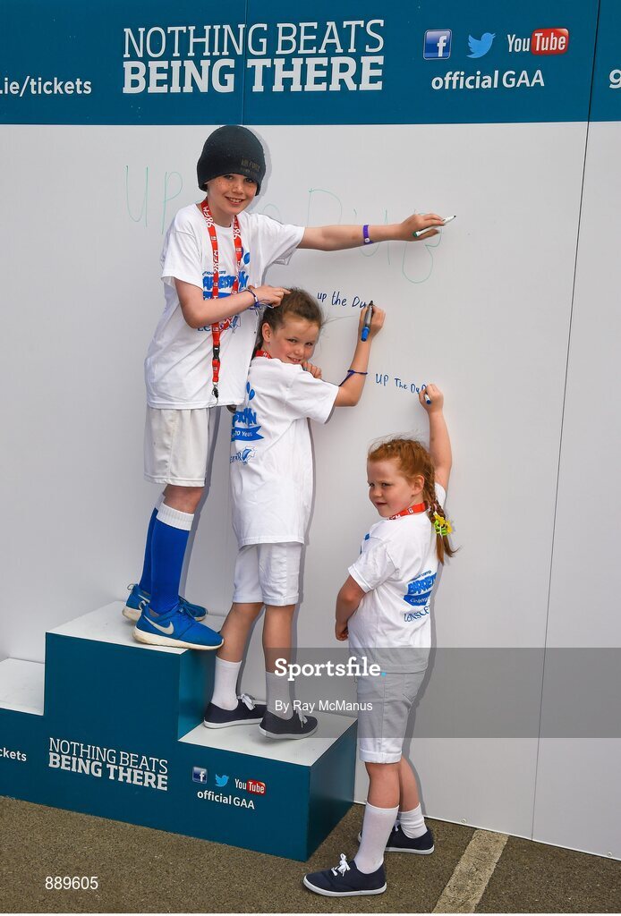 20 July 2014; Seamus, aged 10, Grace, aged 7, and Heather, aged 6, from Ringsend, at the 'Fan zone' before the game. Leinster GAA Football Senior Championship Final, Dublin v Meath, Croke Park, Dublin. Picture credit: Ray McManus / SPORTSFILE