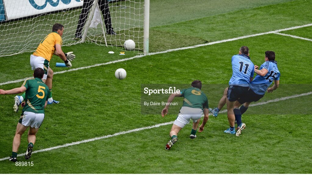 20 July 2014; Bernard Brogan, 15, Dublin, scores his side's first goal ahead of his brother Alan. Leinster GAA Football Senior Championship Final, Dublin v Meath, Croke Park, Dublin. Picture credit: Dáire Brennan / SPORTSFILE
