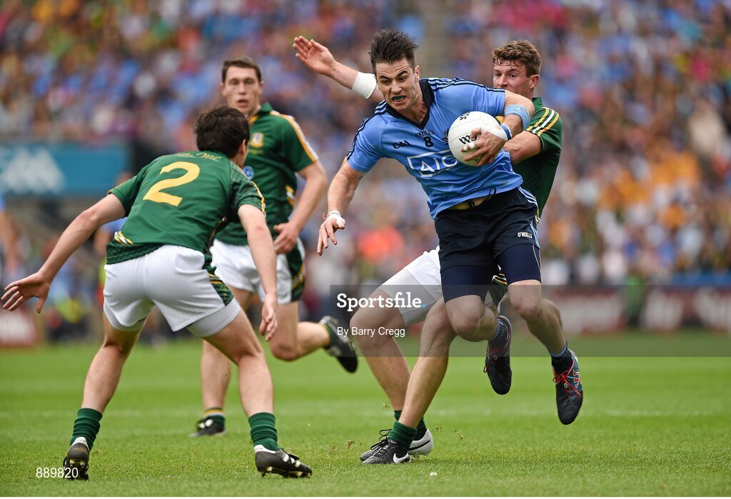 20 July 2014; Michael Darragh McCauley, Dublin, in action against Eoghan Harrington, left, and Shane O'Rourke, Meath. Leinster GAA Football Senior Championship Final, Dublin v Meath, Croke Park, Dublin. Picture credit: Barry Cregg / SPORTSFILE