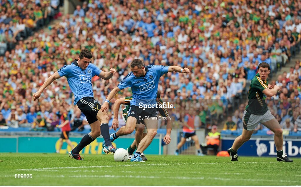 20 July 2014; Bernard Brogan, left, Dublin, scores his side's first goal ahead of his brother Alan. Leinster GAA Football Senior Championship Final, Dublin v Meath, Croke Park, Dublin. Picture credit: Tómas Greally / SPORTSFILE