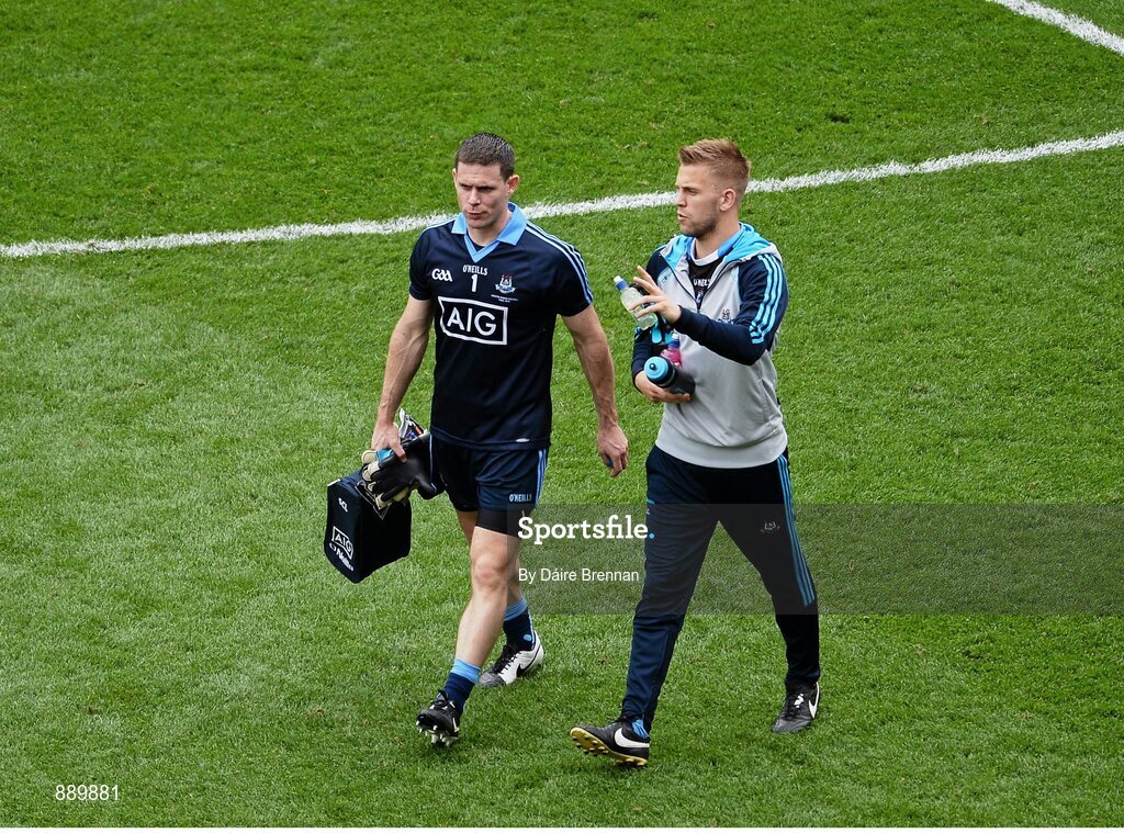 20 July 2014; Dublin captain Stephen Cluxton with John Cooper at half time. Cooper was listed to start the game but subsequently did not. Leinster GAA Football Senior Championship Final, Dublin v Meath, Croke Park, Dublin. Picture credit: Dáire Brennan / SPORTSFILE