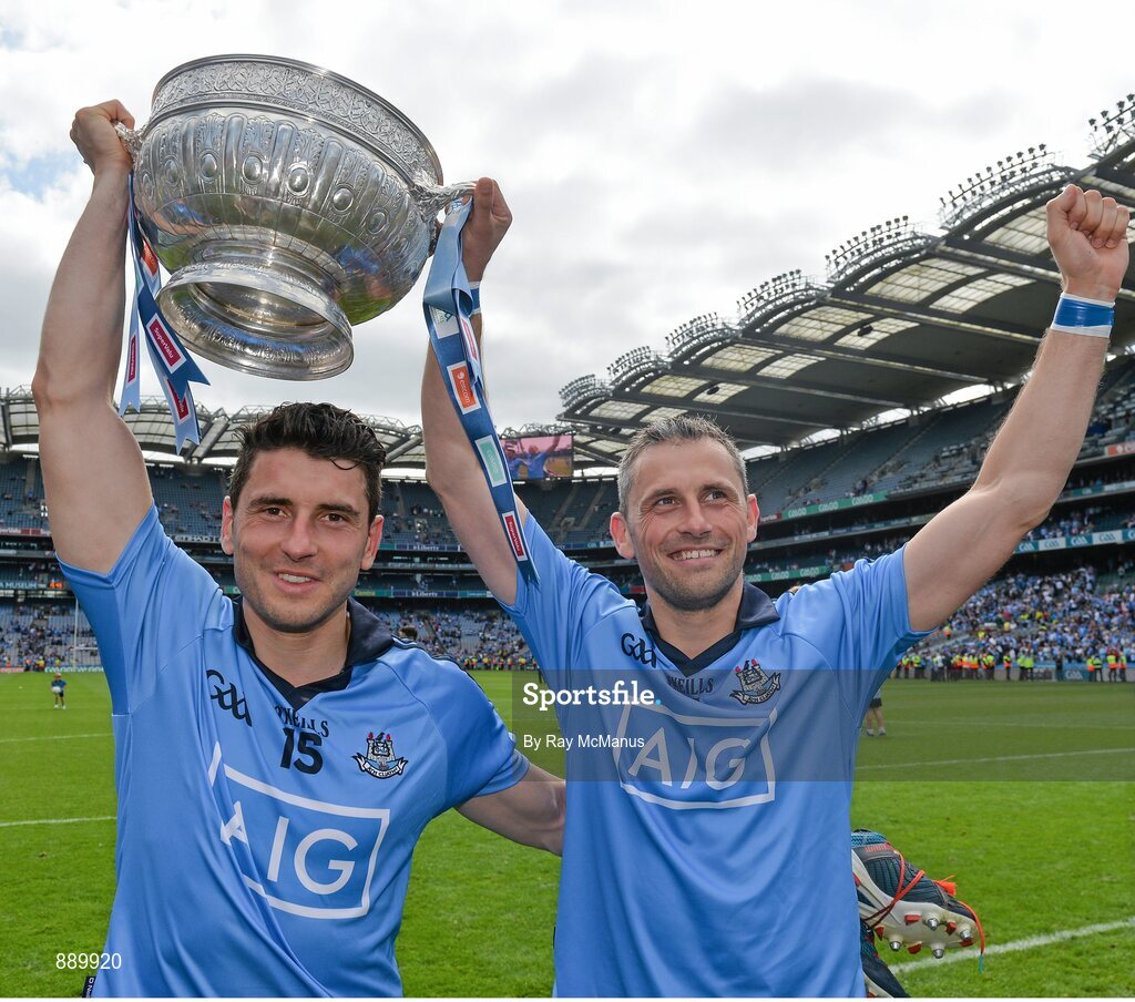 20 July 2014; Dublin forwards Bernard and Alan Brogan with the Delaney Cup after the game. Leinster GAA Football Senior Championship Final, Dublin v Meath, Croke Park, Dublin. Picture credit: Ray McManus / SPORTSFILE