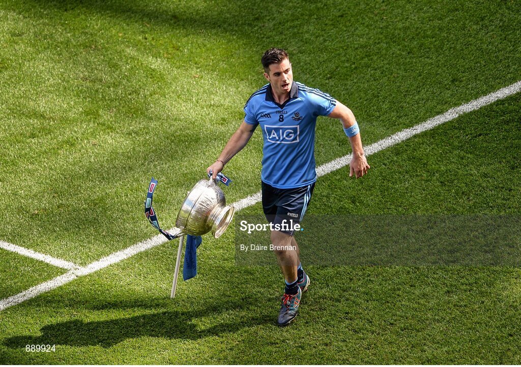 20 July 2014; Michael Darragh MacAuley, Dublin, celebrates with the Delaney Cup after the game. Leinster GAA Football Senior Championship Final, Dublin v Meath, Croke Park, Dublin. Picture credit: Dáire Brennan / SPORTSFILE