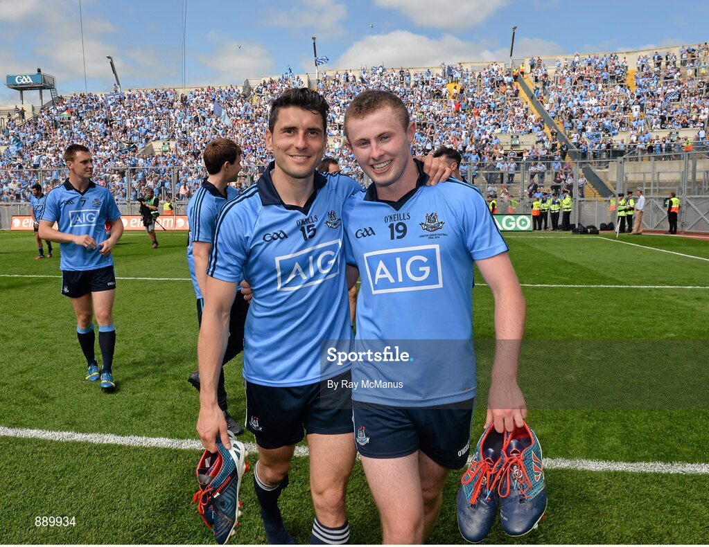 20 July 2014; Dublin players Bernard Brogan and Jack McCaffrey celebrate after the game. Leinster GAA Football Senior Championship Final, Dublin v Meath, Croke Park, Dublin. Picture credit: Ray McManus / SPORTSFILE