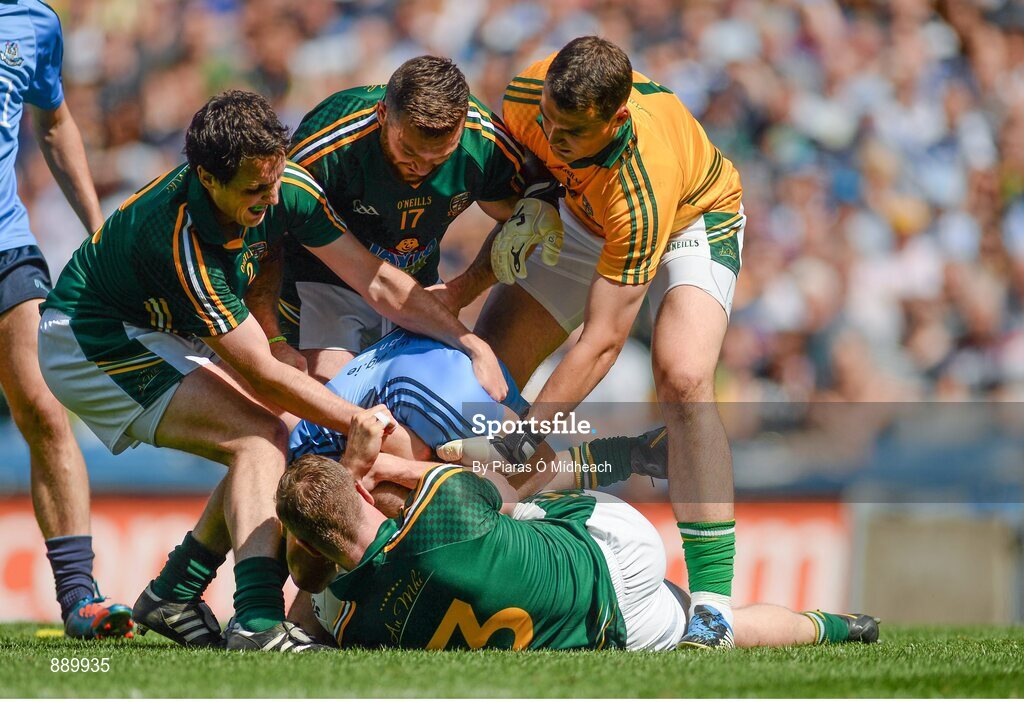 20 July 2014; Dublin's Eoghan O'Gara is involved in an off the ball incident in the second half with Meath players from clockwise, Eoghan Harrington, Michael Burke, Patrick O'Rourke and Kevin Reilly, bottom. Leinster GAA Football Senior Championship Final, Dublin v Meath, Croke Park, Dublin. Picture credit: Piaras Ó Mídheach / SPORTSFILE