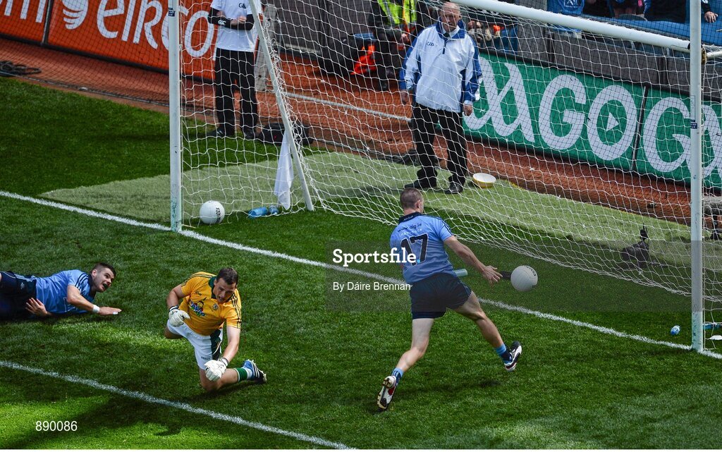 20 July 2014; Dean Rock, Dublin, hits the post from a fisted effort during the second half. Leinster GAA Football Senior Championship Final, Dublin v Meath, Croke Park, Dublin. Picture credit: Dáire Brennan / SPORTSFILE