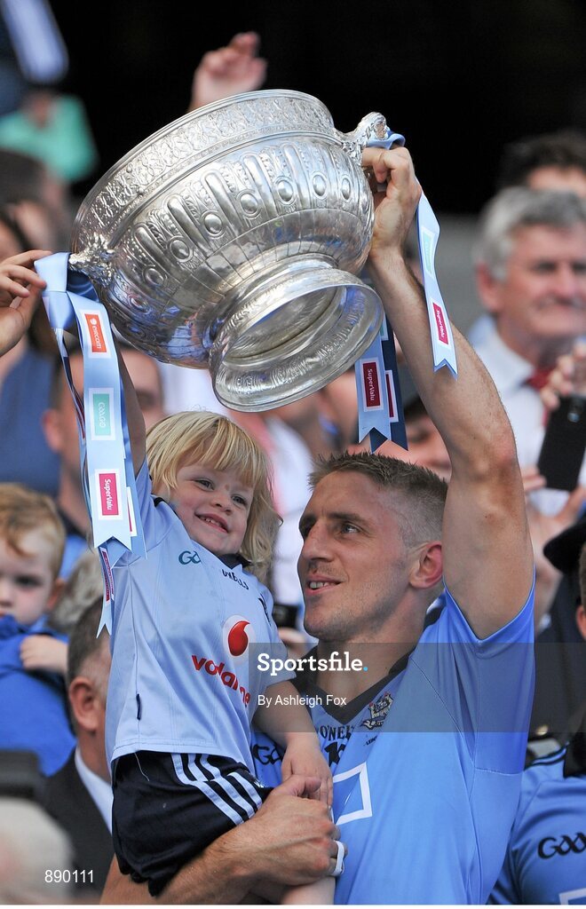 20 July 2014; Dublin's Eoghan O'Gara lifts the Delaney Cup with his daughter Ella. Leinster GAA Football Senior Championship Final, Dublin v Meath, Croke Park, Dublin. Picture credit: Ashleigh Fox / SPORTSFILE