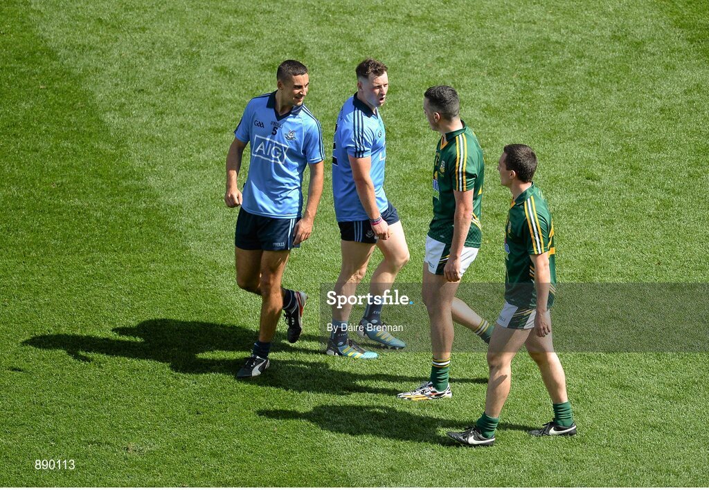20 July 2014; James McCarthy, left, and Philip McMahon, Dublin, exchange verbals with Andrew Tormey, left, and James McEntee. Leinster GAA Football Senior Championship Final, Dublin v Meath, Croke Park, Dublin. Picture credit: Dáire Brennan / SPORTSFILE
