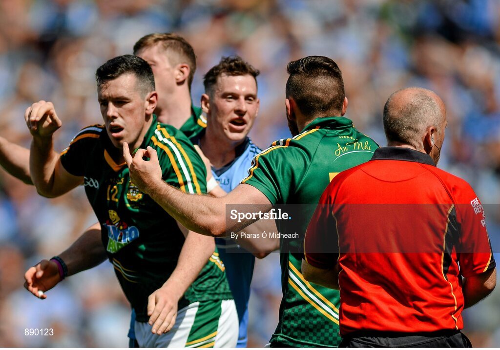 20 July 2014; Michael Burke, right, Meath, gestures during a tussle in the second half. Leinster GAA Football Senior Championship Final, Dublin v Meath, Croke Park, Dublin. Picture credit: Piaras Ó Mídheach / SPORTSFILE