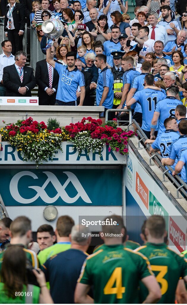 20 July 2014; Dublin's Cian O'Sullivan lifts the Delaney cup as Meath players leave the field after the cup presentation. Leinster GAA Football Senior Championship Final, Dublin v Meath, Croke Park, Dublin. Picture credit: Piaras Ó Mídheach / SPORTSFILE
