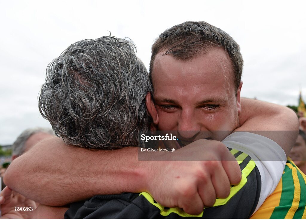20 July 2014; Donegal manager Jim McGuinness embraces Michael Murphy after the game. Ulster GAA Football Senior Championship Final, Donegal v Monaghan, St Tiernach's Park, Clones, Co. Monaghan. Picture credit: Oliver McVeigh / SPORTSFILE