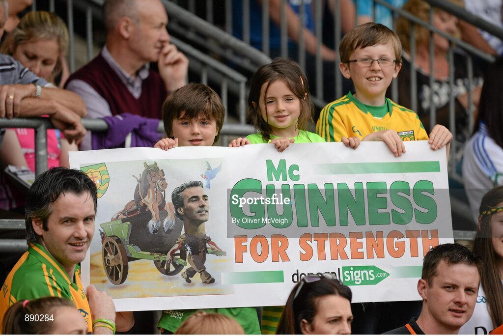 20 July 2014; Donegal fans with a Jimmy McGuinness sign. Ulster GAA Football Senior Championship Final, Donegal v Monaghan, St Tiernach's Park, Clones, Co. Monaghan. Picture credit: Oliver McVeigh / SPORTSFILE