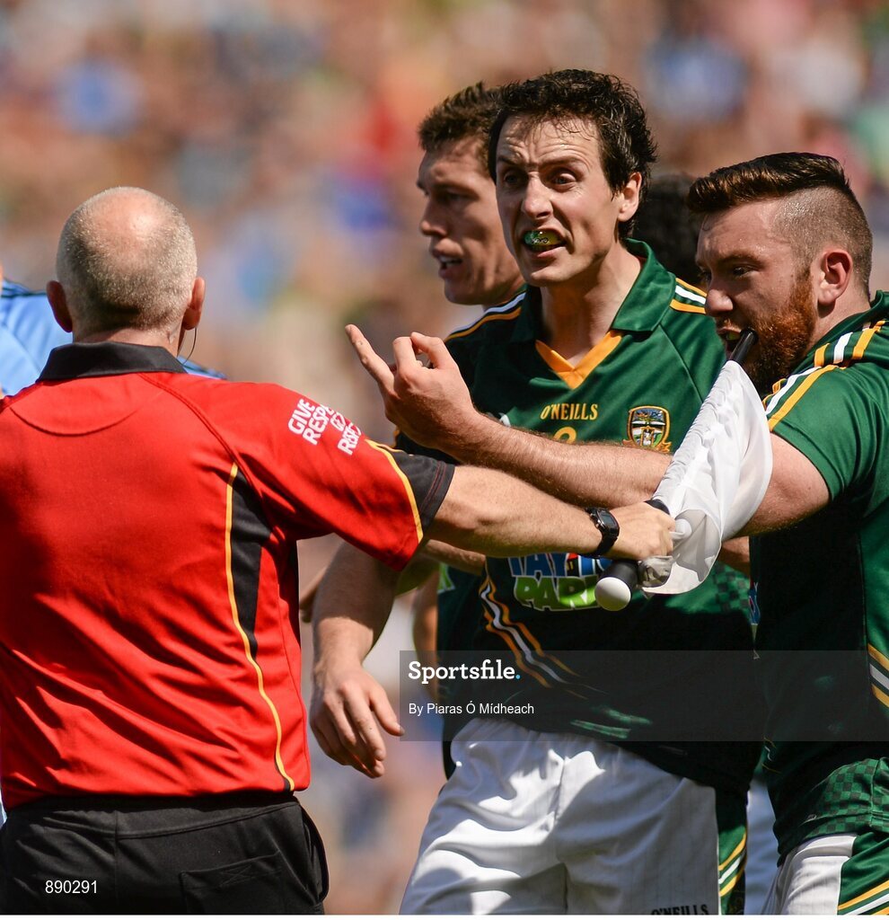 20 July 2014; Michael Burke, right, Meath, gestures during a tussle in the second half. Leinster GAA Football Senior Championship Final, Dublin v Meath, Croke Park, Dublin. Picture credit: Piaras Ó Mídheach / SPORTSFILE