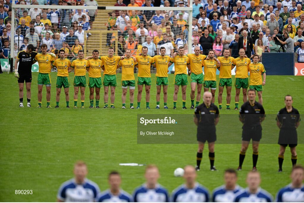 20 July 2014; The Donegal team stand for the National Anthem. Ulster GAA Football Senior Championship Final, Donegal v Monaghan, St Tiernach's Park, Clones, Co. Monaghan. Picture credit: Oliver McVeigh / SPORTSFILE
