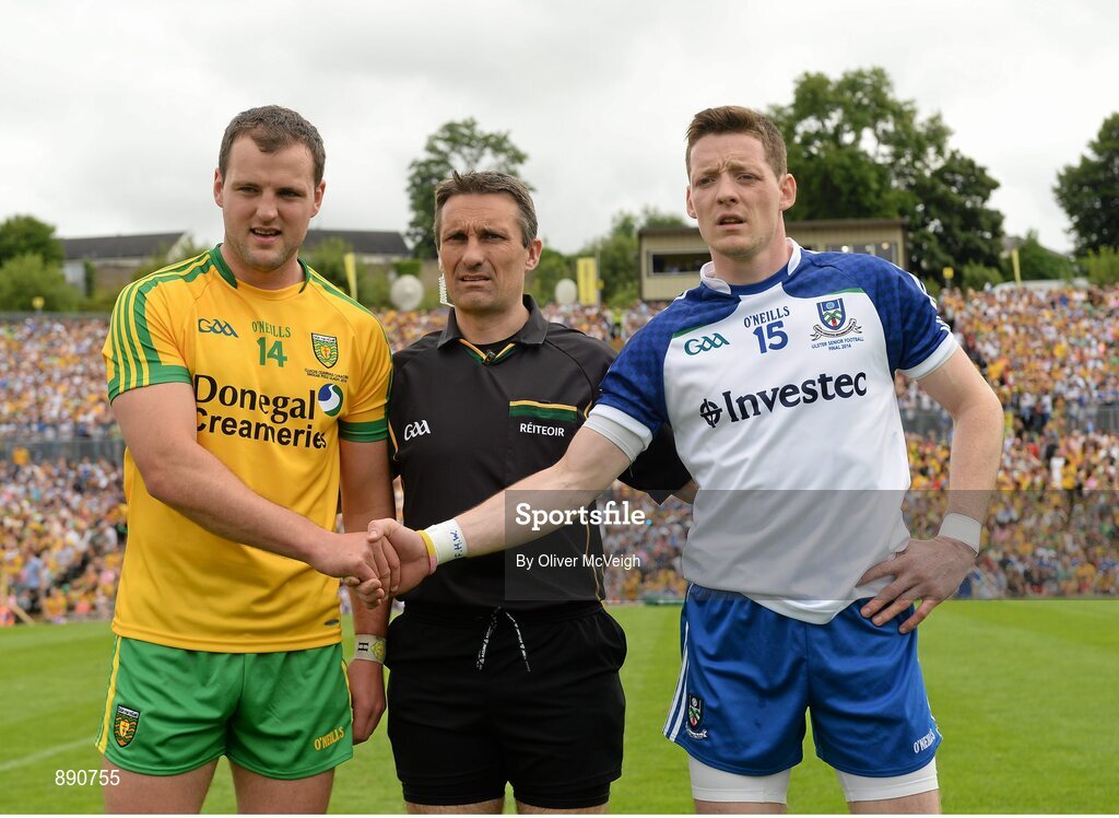 20 July 2014; Referee Maurice Deegan with Donegal captain Michael Murphy and Monaghan captain Conor McManus. Ulster GAA Football Senior Championship Final, Donegal v Monaghan, St Tiernach's Park, Clones, Co. Monaghan. Picture credit: Oliver McVeigh / SPORTSFILE