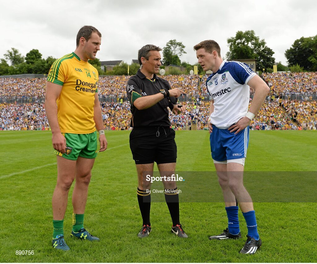 20 July 2014; Referee Maurice Deegan with Donegal captain Michael Murphy and Monaghan captain Conor McManus. Ulster GAA Football Senior Championship Final, Donegal v Monaghan, St Tiernach's Park, Clones, Co. Monaghan. Picture credit: Oliver McVeigh / SPORTSFILE