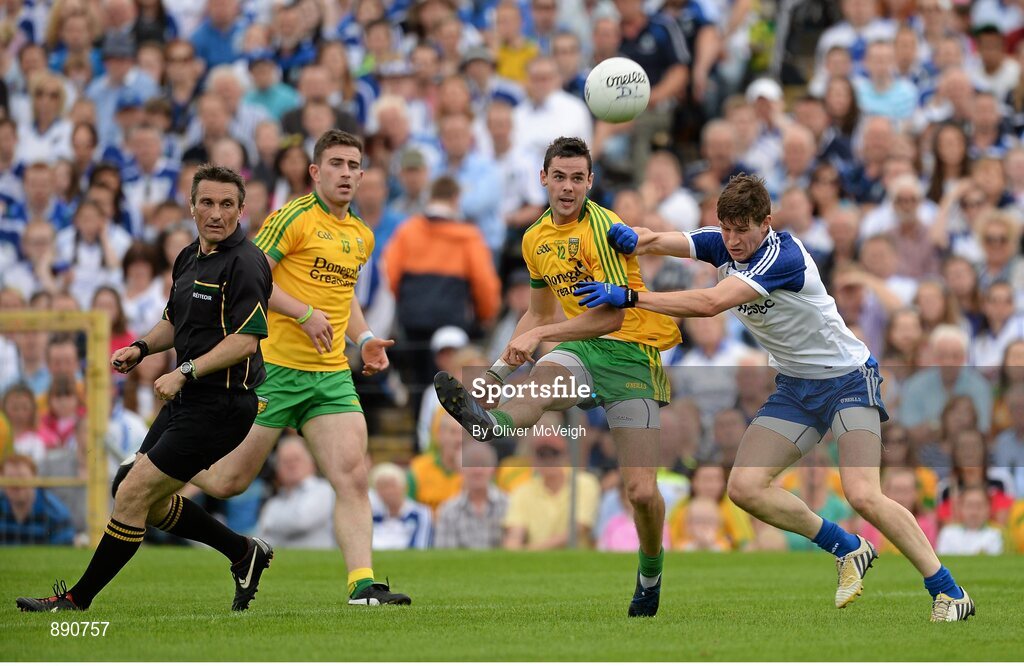 20 July 2014; Odhran MacNiallais, Donega, in action against Darren Hughes, Monaghan. Ulster GAA Football Senior Championship Final, Donegal v Monaghan, St Tiernach's Park, Clones, Co. Monaghan. Picture credit: Oliver McVeigh / SPORTSFILE