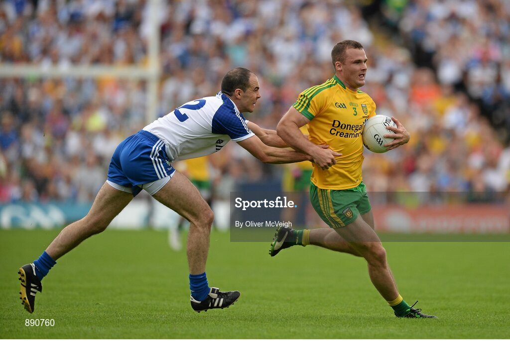20 July 2014; Neil McGee, Donegal, in action against Paul Finlay, Monaghan. Ulster GAA Football Senior Championship Final, Donegal v Monaghan, St Tiernach's Park, Clones, Co. Monaghan. Picture credit: Oliver McVeigh / SPORTSFILE