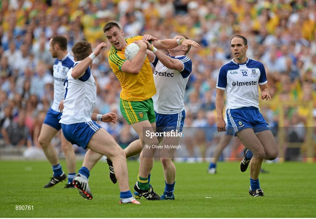 20 July 2014; Leo McLoone, Donegal, in action against Fintan Kelly and Colin Walshe, Monaghan. Ulster GAA Football Senior Championship Final, Donegal v Monaghan, St Tiernach's Park, Clones, Co. Monaghan. Picture credit: Oliver McVeigh / SPORTSFILE