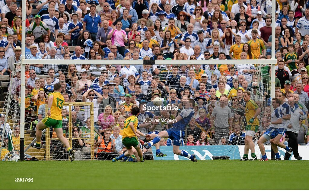 20 July 2014; Ryan McHugh, Donegal, watches as his goal attempt goes over the crossbar. Ulster GAA Football Senior Championship Final, Donegal v Monaghan, St Tiernach's Park, Clones, Co. Monaghan. Picture credit: Oliver McVeigh / SPORTSFILE